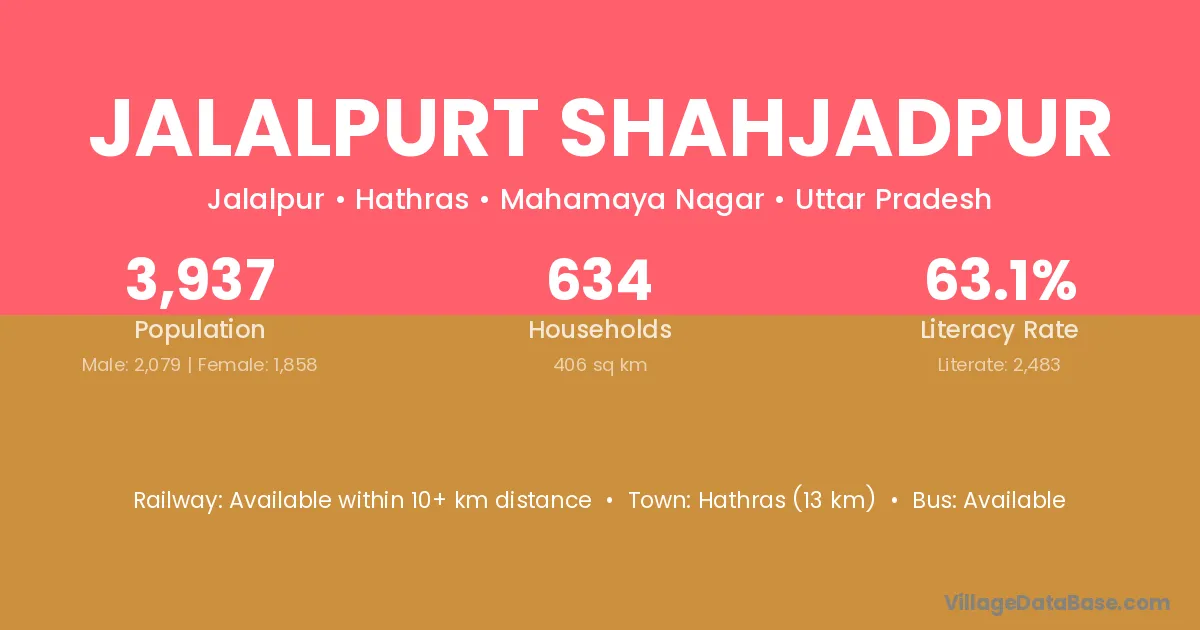 Hathras (13 km) is the nearest town to Jalalpurt Shahjadpur village for major economic activities and is located approximately 13 km away.