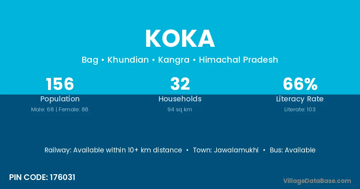 The literacy rate of Koka village is 60.95%. Male literacy stands at 71.26% and female literacy at 49.30%.