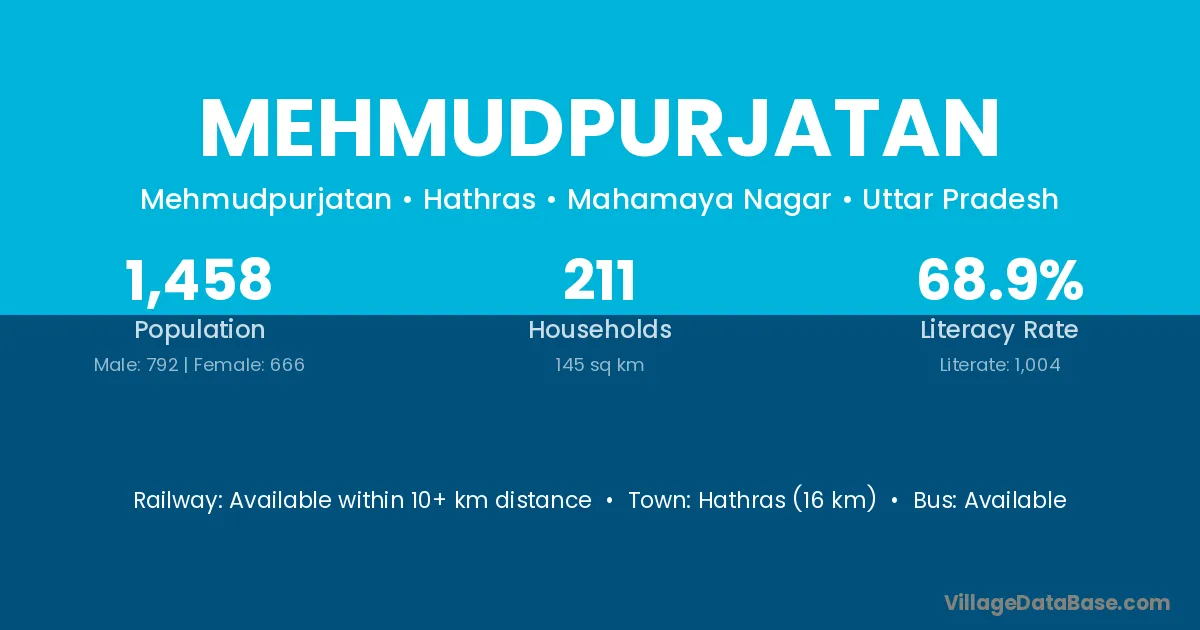 Hathras (16 km) is the nearest town to Mehmudpurjatan village for major economic activities and is located approximately 16 km away.