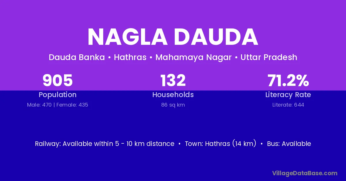 Hathras (14 km) is the nearest town to Nagla Dauda village for major economic activities and is located approximately 14 km away.