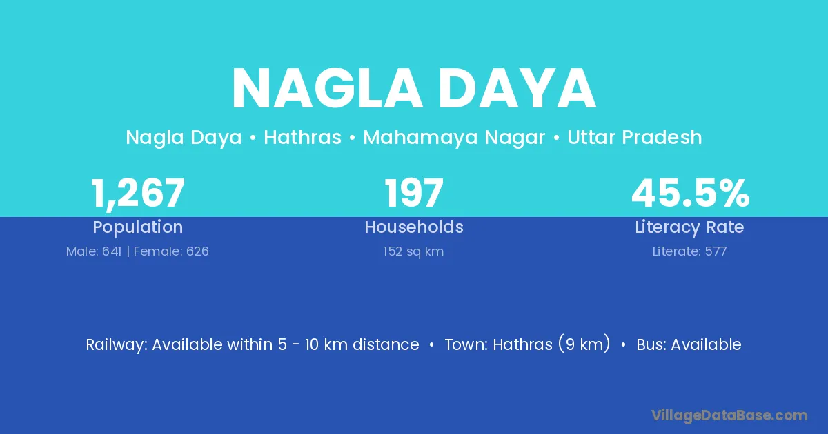 Hathras (9 km) is the nearest town to Nagla Daya village for major economic activities and is located approximately 9 km away.