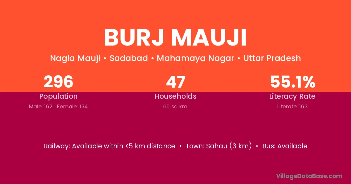 Sahau (3 km) is the nearest town to Burj Mauji village for major economic activities and is located approximately 3 km away.