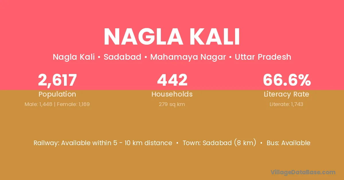 Sadabad (8 km) is the nearest town to Nagla Kali village for major economic activities and is located approximately 8 km away.
