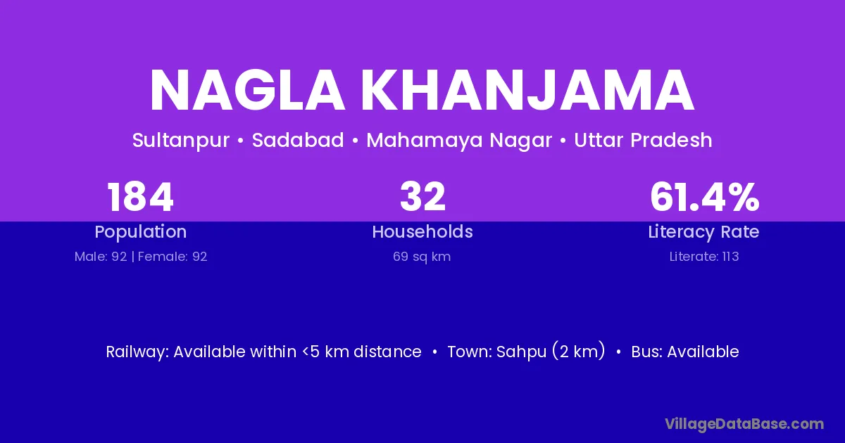Nagla Khanjama village has a total population of 184 people, of which 92 are males and 92 are females.