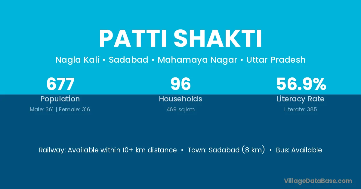 Sadabad (8 km) is the nearest town to Patti Shakti village for major economic activities and is located approximately 8 km away.