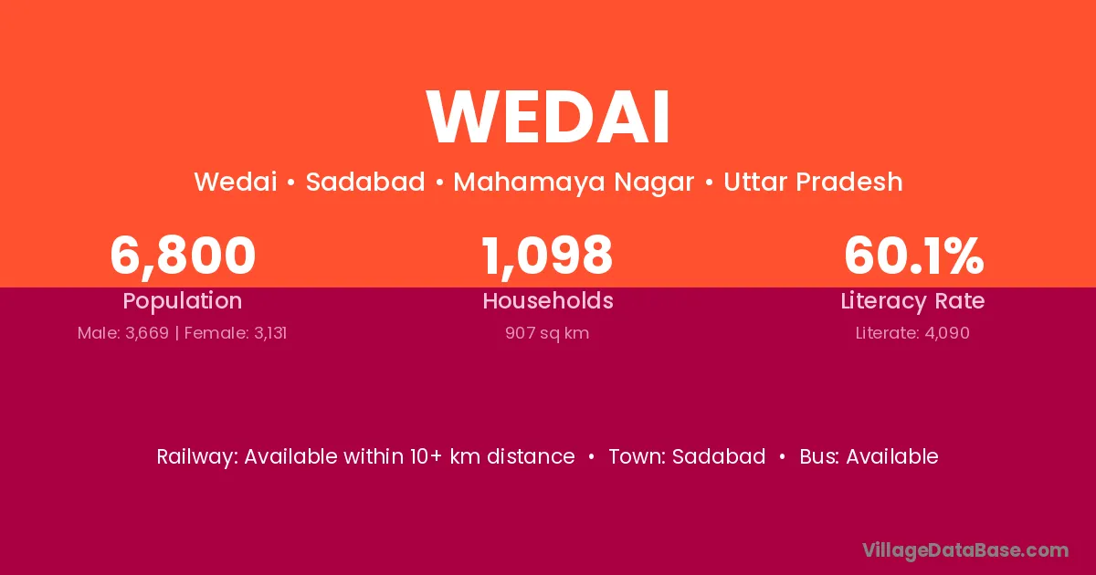 Wedai village has a total population of 6,800 people, of which 3,669 are males and 3,131 are females.