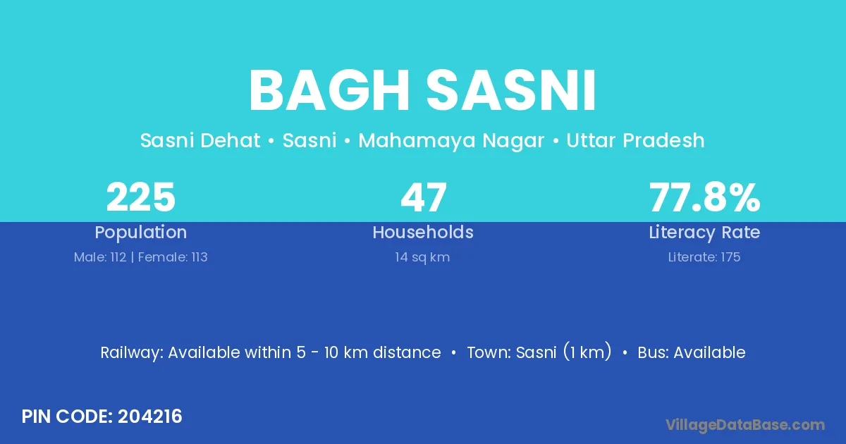 Sasni (1 km) is the nearest town to Bagh Sasni village for major economic activities and is located approximately 1 km away.