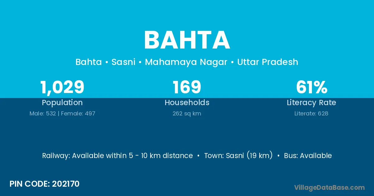 Sasni (19 km) is the nearest town to Bahta village for major economic activities and is located approximately 19 km away.