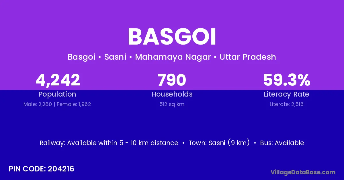 Sasni (9 km) is the nearest town to Basgoi village for major economic activities and is located approximately 9 km away.