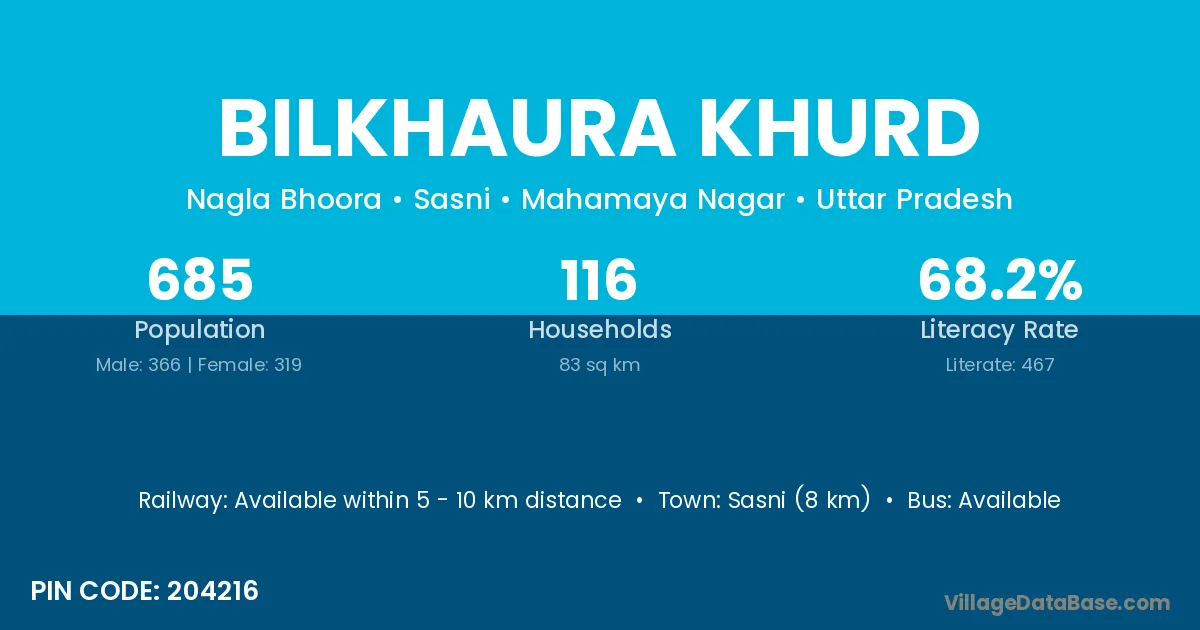 Sasni (8 km) is the nearest town to Bilkhaura Khurd village for major economic activities and is located approximately 8 km away.