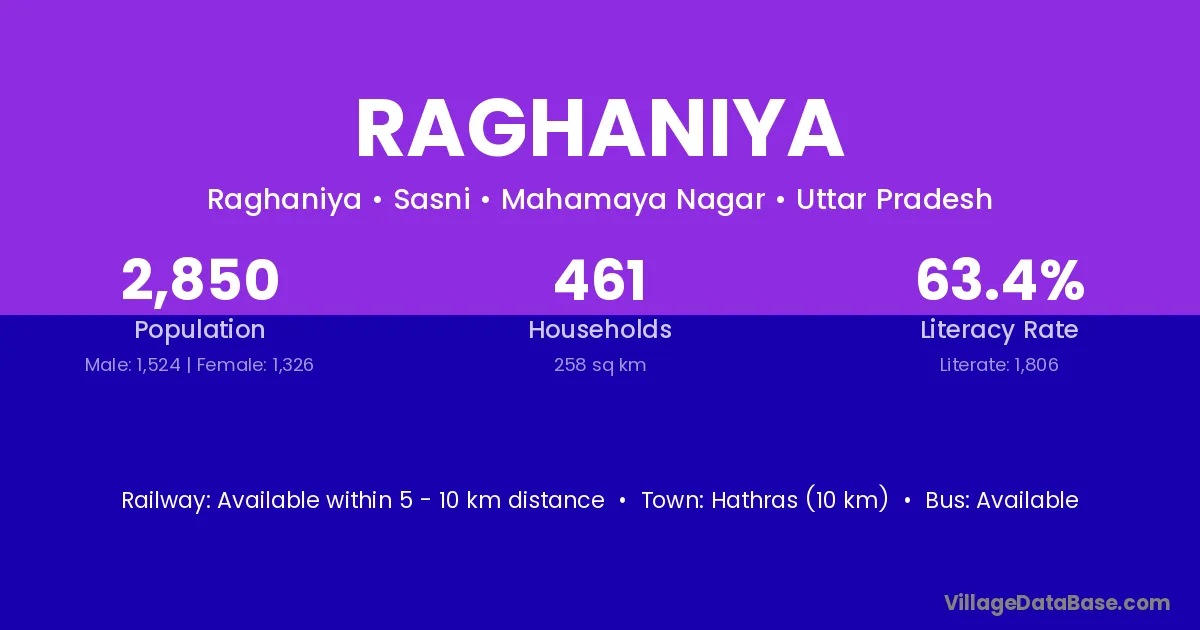 Hathras (10 km) is the nearest town to Raghaniya village for major economic activities and is located approximately 10 km away.