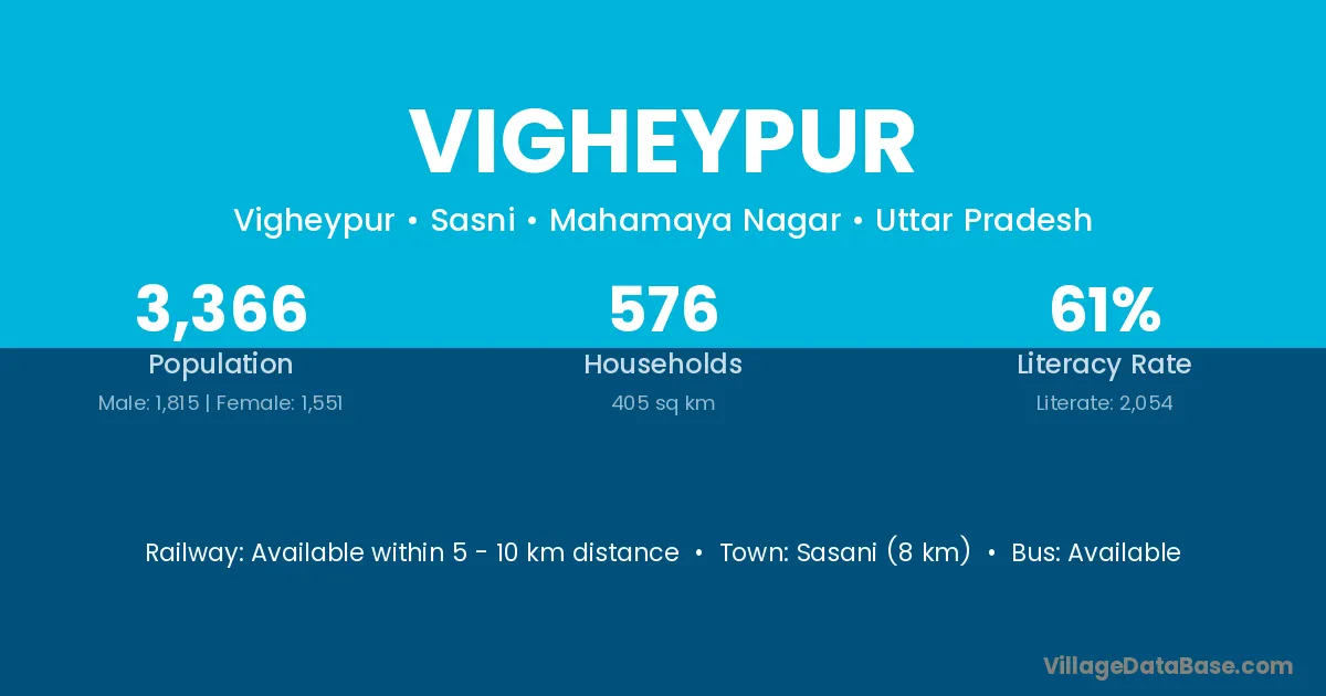 Sasani (8 km) is the nearest town to Vigheypur village for major economic activities and is located approximately 8 km away.