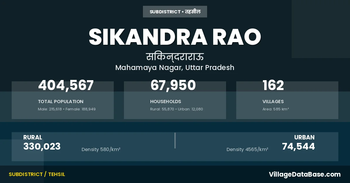 According to the 2011 census The total area of Sikandra Rao Tehsil is 585 km², with a population of 404567 people. The population density is 692 inhabitants per square kilometre, and there are approximately 67950 houses in the sub district.