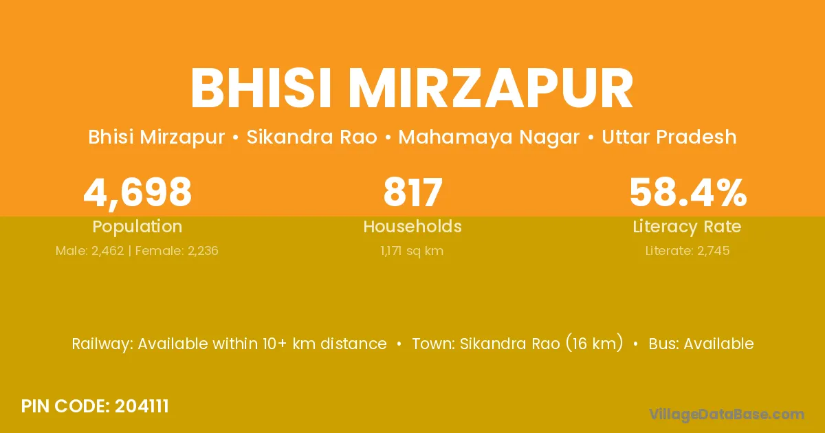 Sikandra Rao (16 km) is the nearest town to Bhisi Mirzapur village for major economic activities and is located approximately 16 km away.
