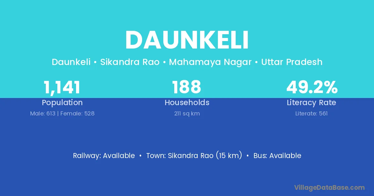 Sikandra Rao (15 km) is the nearest town to Daunkeli village for major economic activities and is located approximately 15 km away.