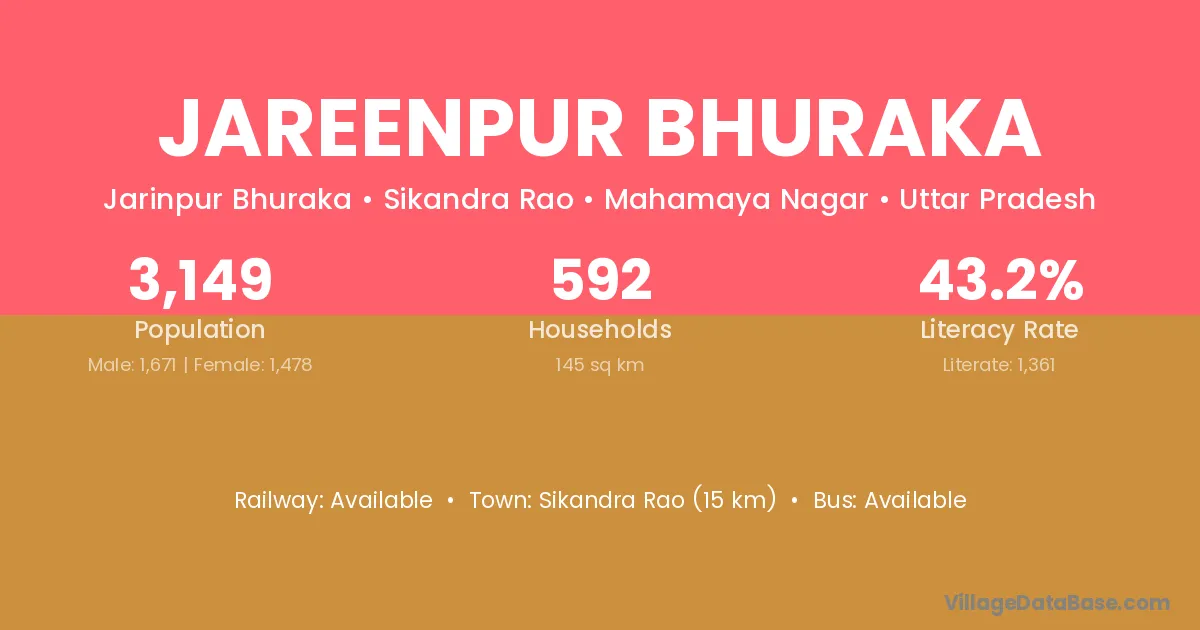 Sikandra Rao (15 km) is the nearest town to Jareenpur Bhuraka village for major economic activities and is located approximately 15 km away.
