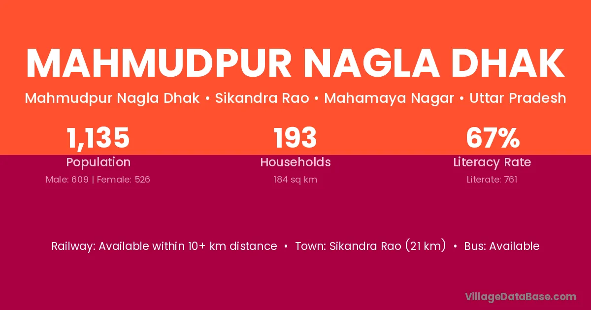 Mahmudpur Nagla Dhak village has a total population of 1,135 people, of which 609 are males and 526 are females.