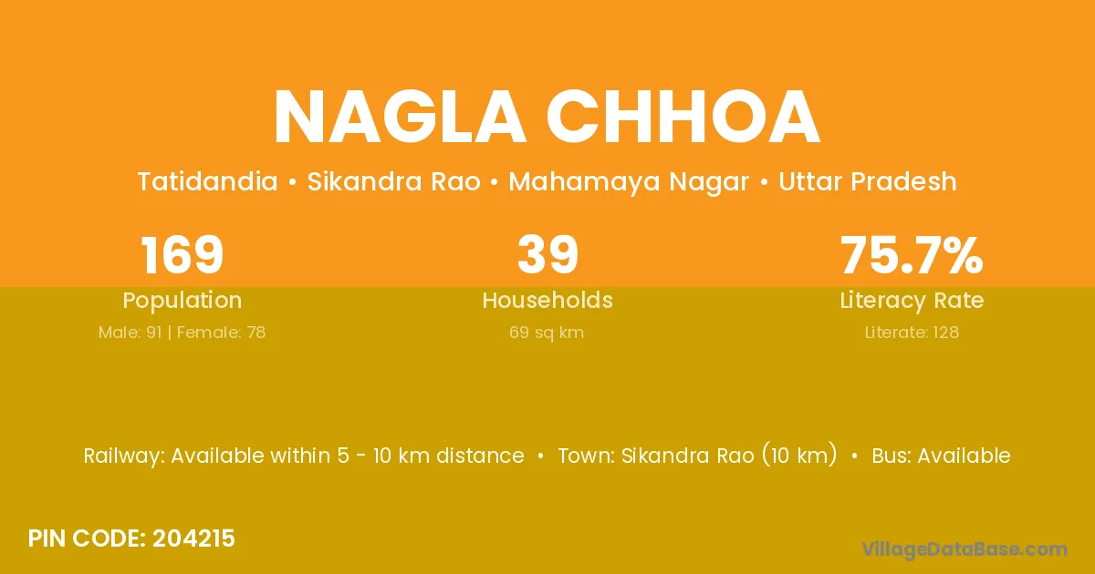 Sikandra Rao (10 km) is the nearest town to Nagla Chhoa village for major economic activities and is located approximately 10 km away.