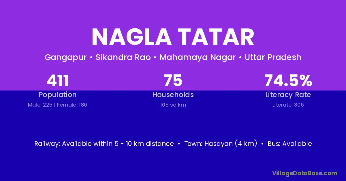 Nagla Tatar village has a total population of 411 people, of which 225 are males and 186 are females.