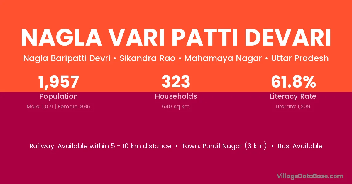Nagla Vari Patti Devari village has a total population of 1,957 people, of which 1,071 are males and 886 are females.