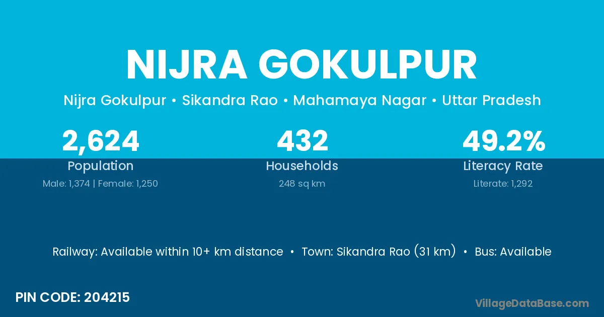 Sikandra Rao (31 km) is the nearest town to Nijra Gokulpur village for major economic activities and is located approximately 31 km away.