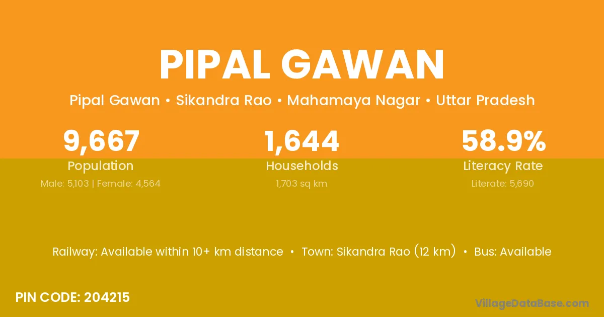 Sikandra Rao (12 km) is the nearest town to Pipal Gawan village for major economic activities and is located approximately 12 km away.