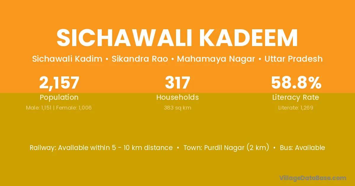 Sichawali Kadeem village has a total population of 2,157 people, of which 1,151 are males and 1,006 are females.