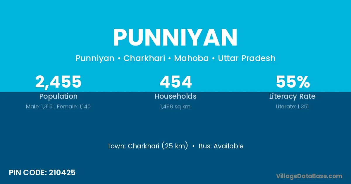 Charkhari (25 km) is the nearest town to Punniyan village for major economic activities and is located approximately 25 km away.
