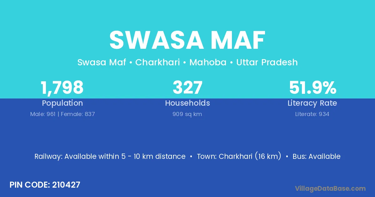 Charkhari (16 km) is the nearest town to Swasa Maf village for major economic activities and is located approximately 16 km away.