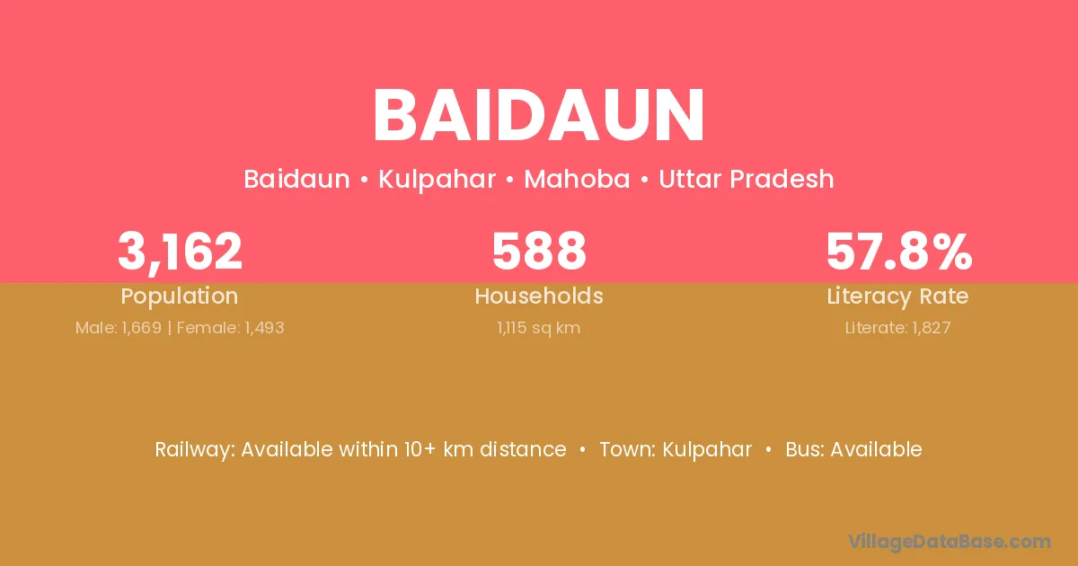 Baidaun village has a total population of 3,162 people, of which 1,669 are males and 1,493 are females.