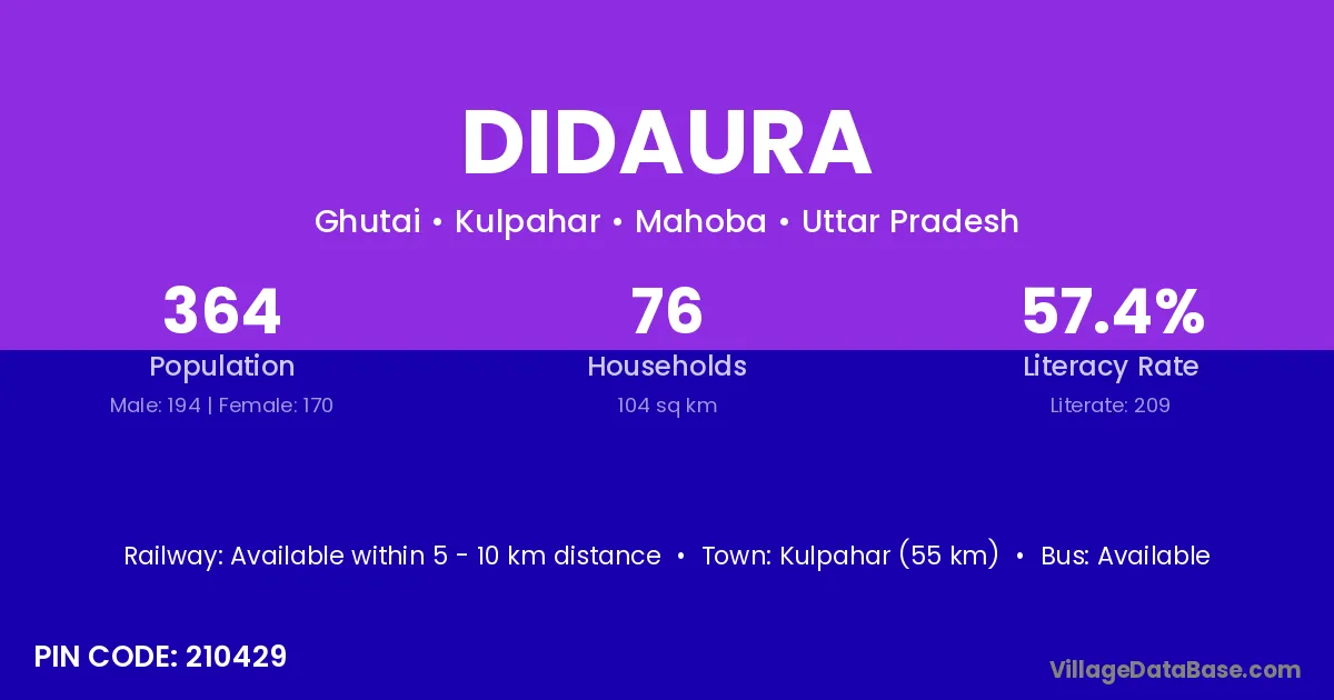 Kulpahar (55 km) is the nearest town to Didaura village for major economic activities and is located approximately 55 km away.