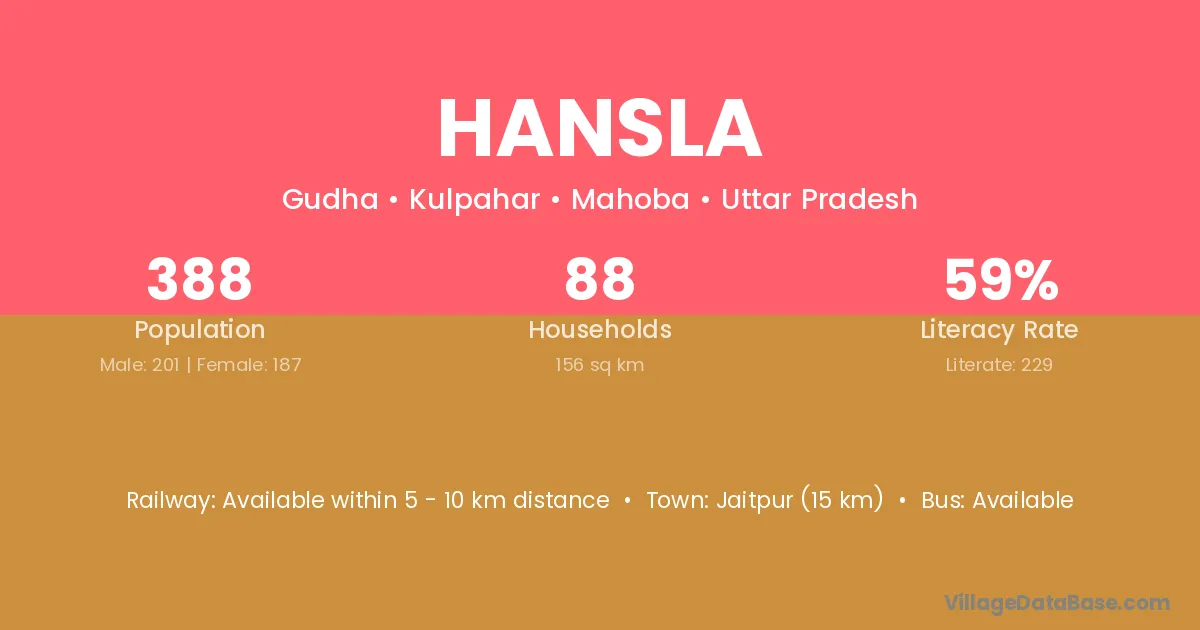 Hansla village has a total population of 388 people, of which 201 are males and 187 are females.