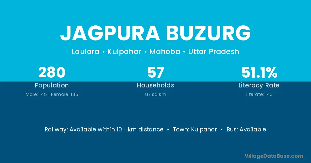Jagpura Buzurg village has a total population of 280 people, of which 145 are males and 135 are females.