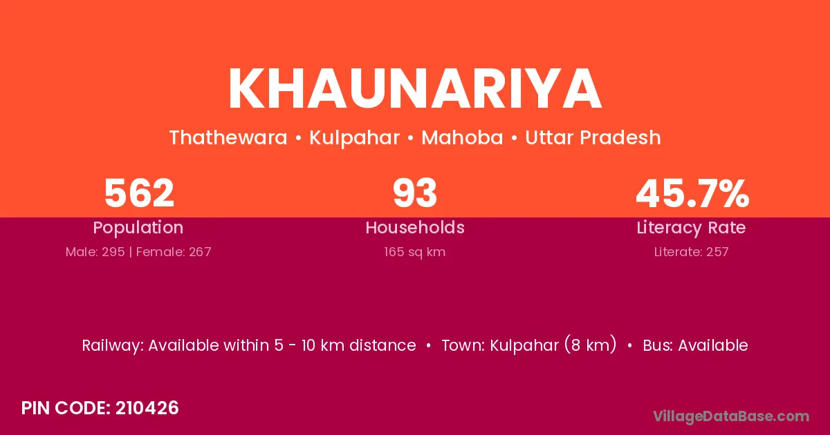 Khaunariya village has a total population of 562 people, of which 295 are males and 267 are females.