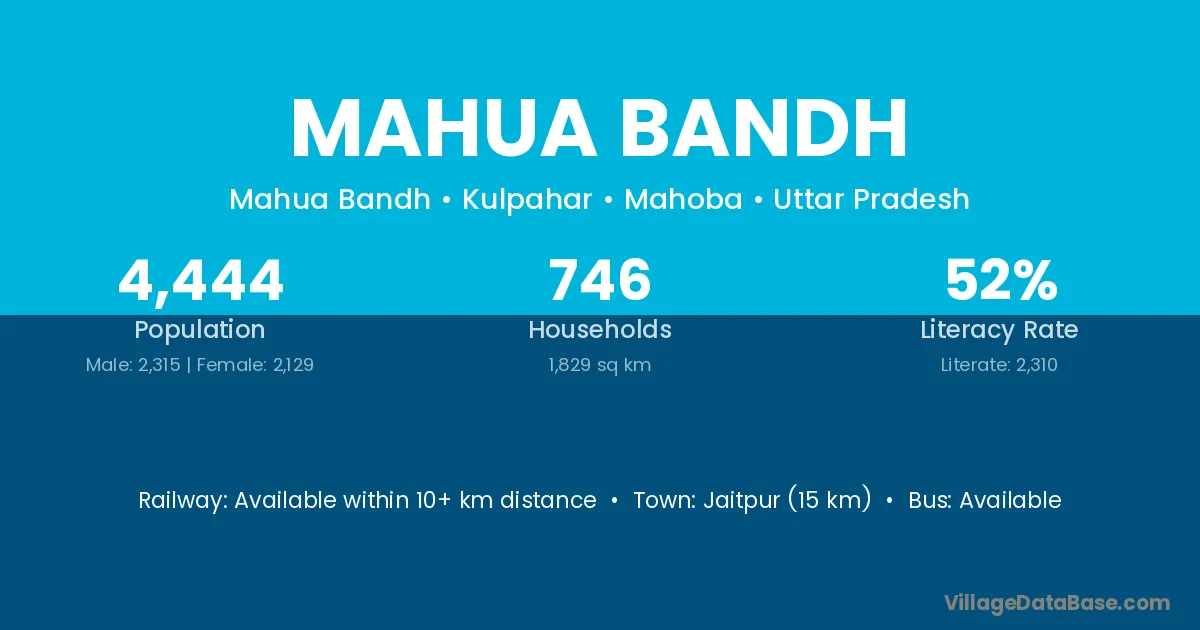 Mahua Bandh village has a total population of 4,444 people, of which 2,315 are males and 2,129 are females.