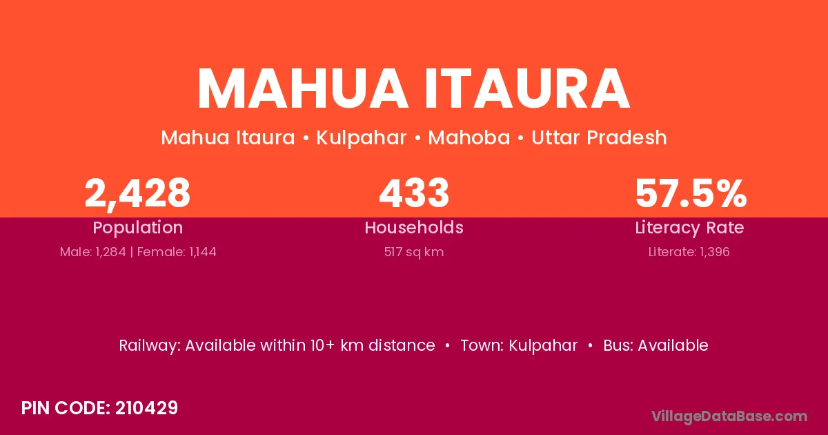 Mahua Itaura village has a total population of 2,428 people, of which 1,284 are males and 1,144 are females.