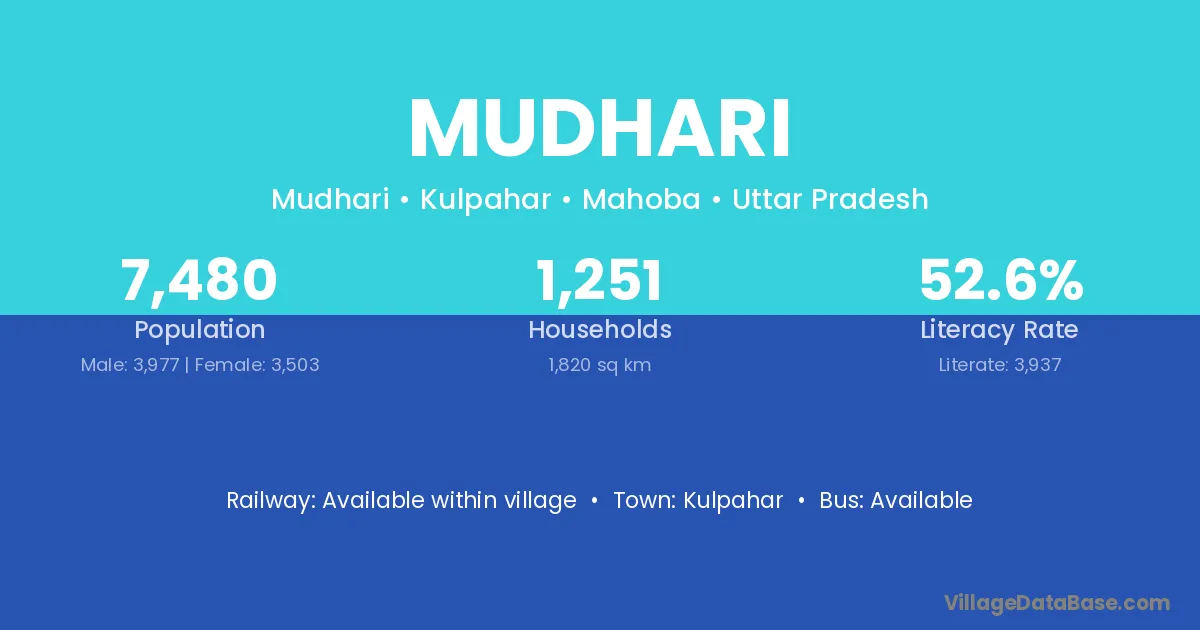 Mudhari village has a total population of 7,480 people, of which 3,977 are males and 3,503 are females.