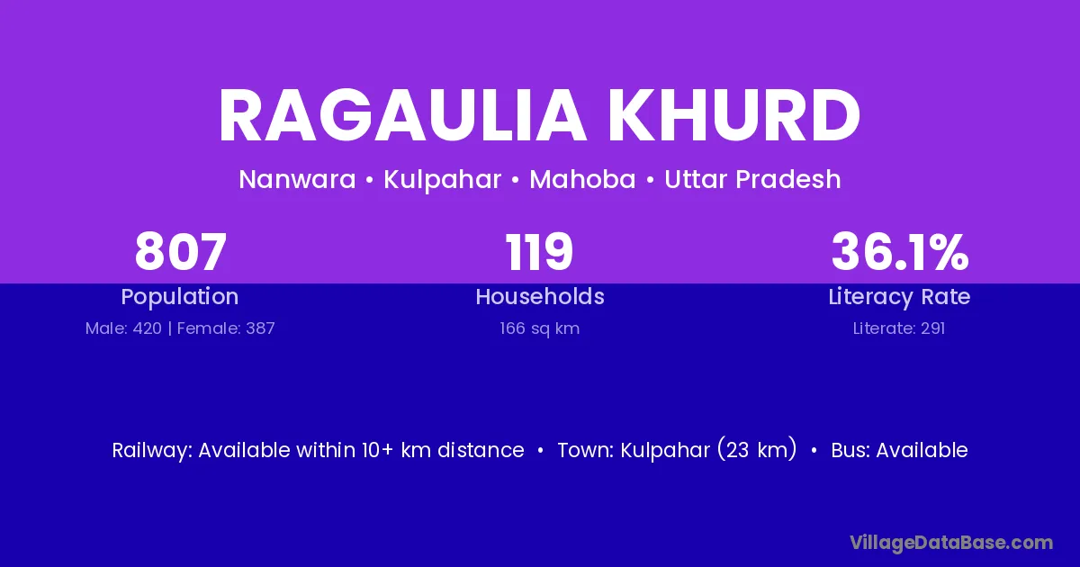 Kulpahar (23 km) is the nearest town to Ragaulia Khurd village for major economic activities and is located approximately 23 km away.