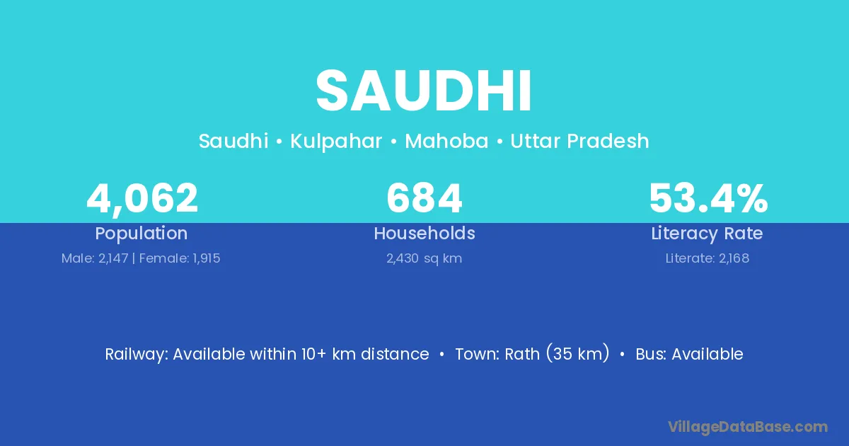Saudhi village has a total population of 4,062 people, of which 2,147 are males and 1,915 are females.