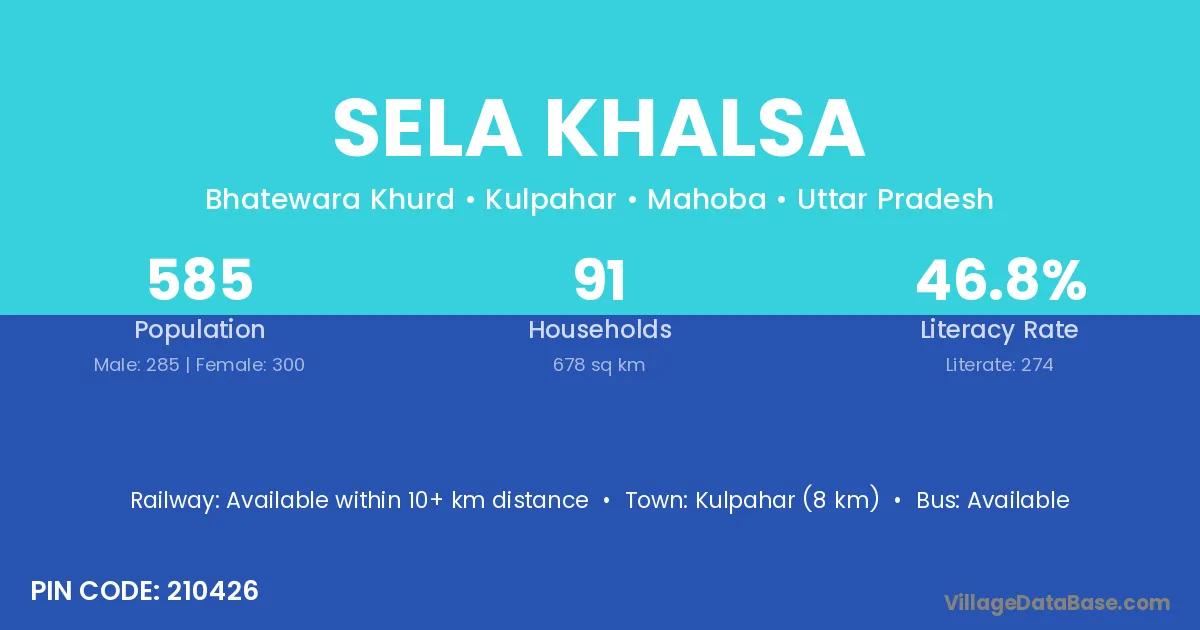 Kulpahar (8 km) is the nearest town to Sela Khalsa village for major economic activities and is located approximately 8 km away.