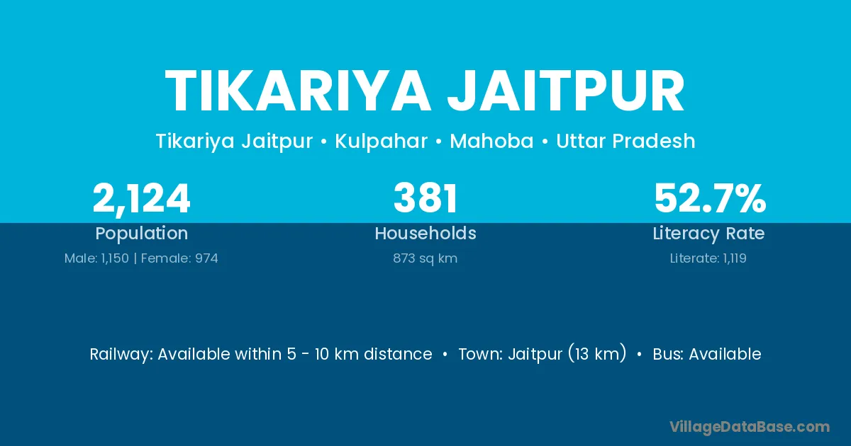 Tikariya Jaitpur village has a total population of 2,124 people, of which 1,150 are males and 974 are females.