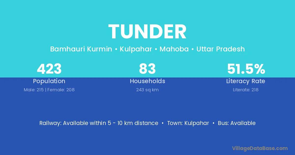 Tunder village has a total population of 423 people, of which 215 are males and 208 are females.