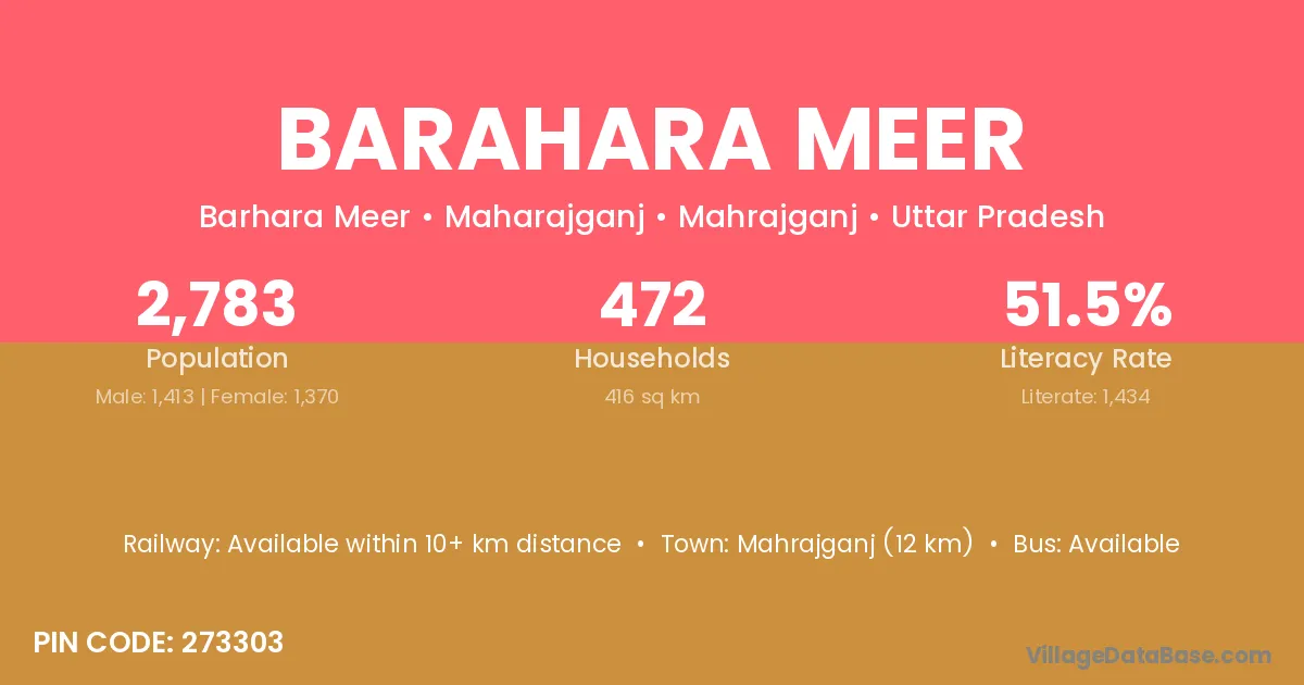 Mahrajganj (12 km) is the nearest town to Barahara Meer village for major economic activities and is located approximately 12 km away.
