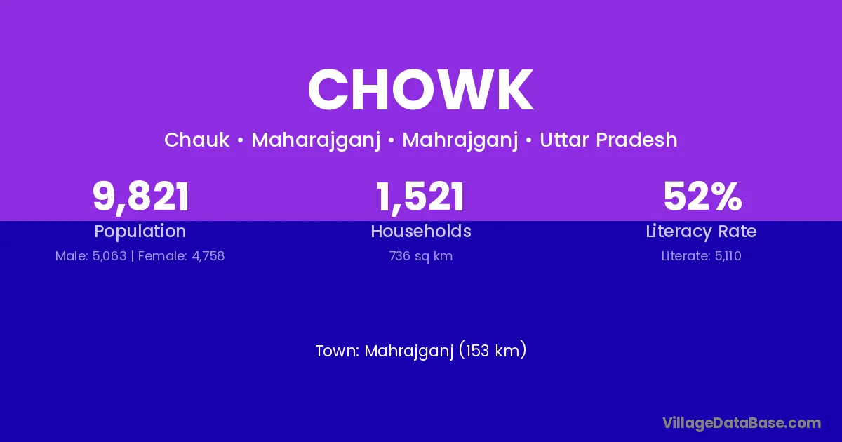 Mahrajganj (153 km) is the nearest town to Chowk village for major economic activities and is located approximately 153 km away.
