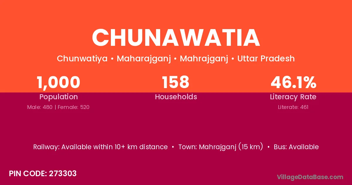 Mahrajganj (15 km) is the nearest town to Chunawatia village for major economic activities and is located approximately 15 km away.
