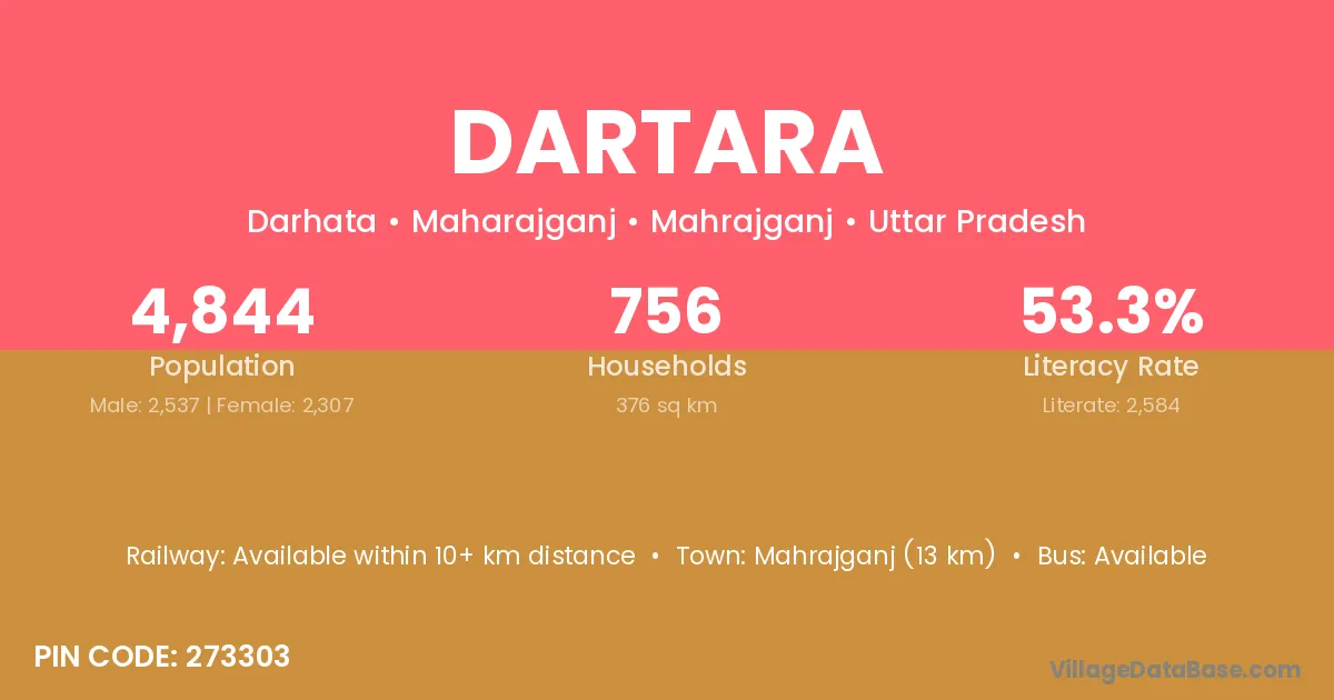 Mahrajganj (13 km) is the nearest town to Dartara village for major economic activities and is located approximately 13 km away.