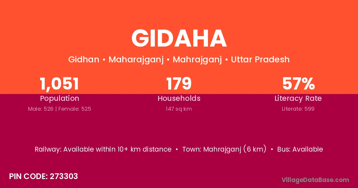 Mahrajganj (6 km) is the nearest town to Gidaha village for major economic activities and is located approximately 6 km away.