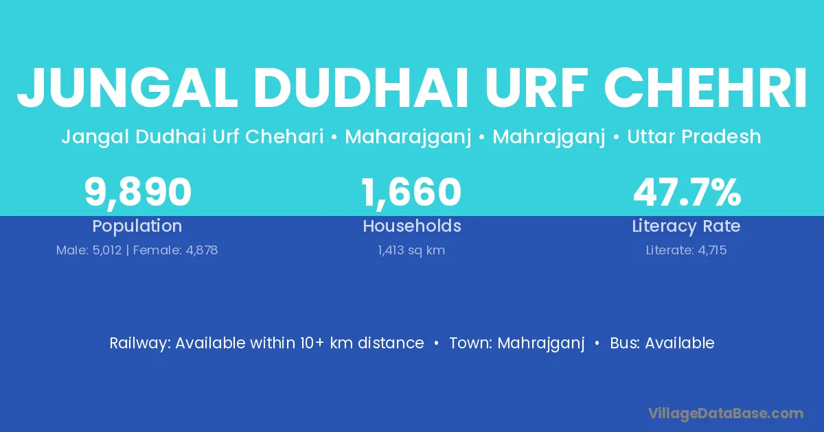 Jungal Dudhai Urf Chehri village has a total population of 9,890 people, of which 5,012 are males and 4,878 are females.