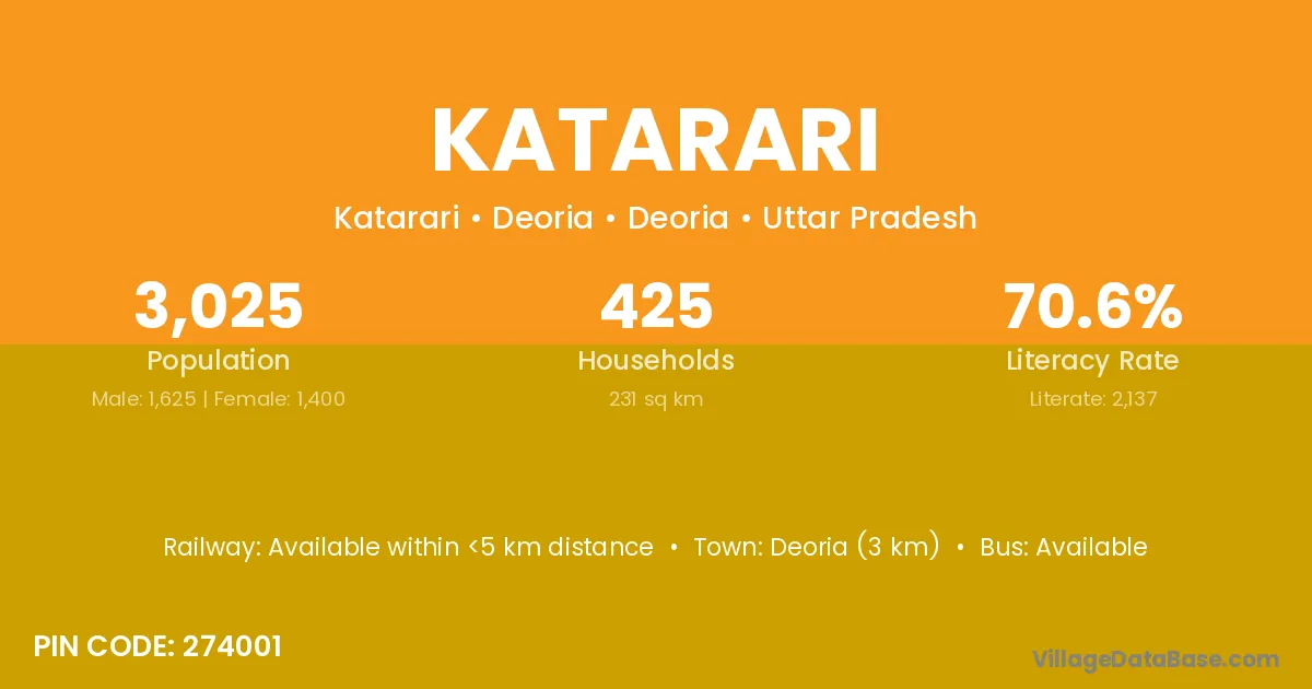 The literacy rate of Katarari village is 60.57%. Male literacy stands at 71.91% and female literacy at 48.30%.