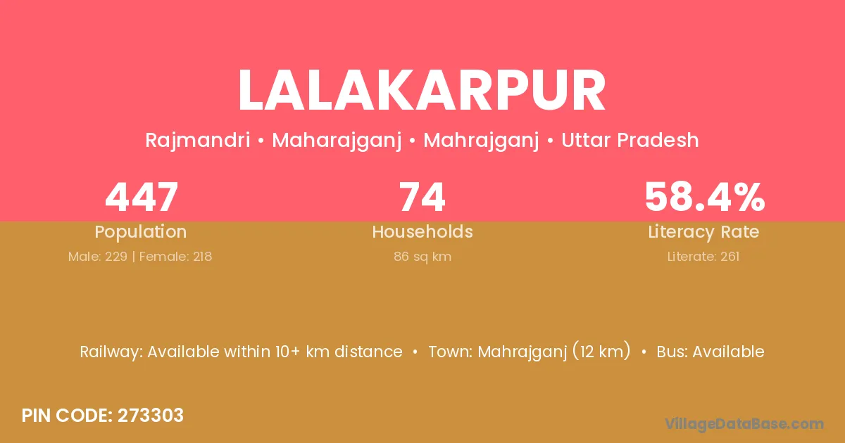 Mahrajganj (12 km) is the nearest town to Lalakarpur village for major economic activities and is located approximately 12 km away.